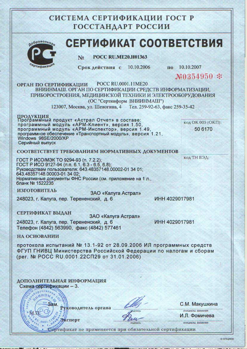 Сертификат соответствия на ПО "Калуга Астрал Отчет"
